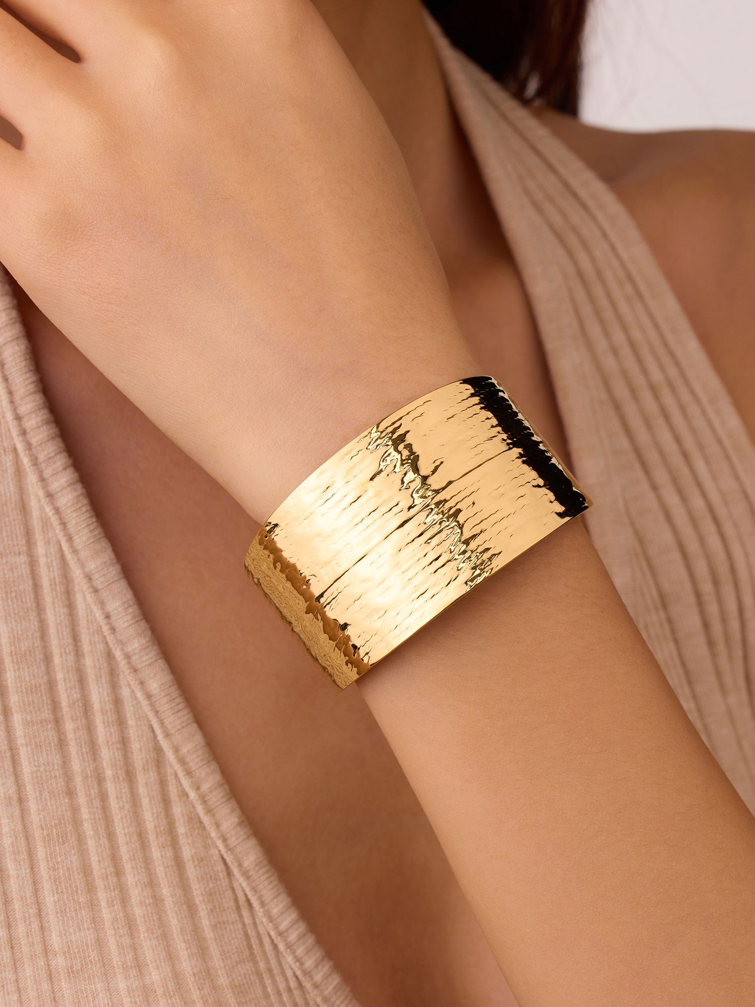 Bracelete aberto minimalista en acabamento dourado. Aço inoxidável. bañado en oro 14K, resistente al agua. El básico perfecto para sumar brillo diario.